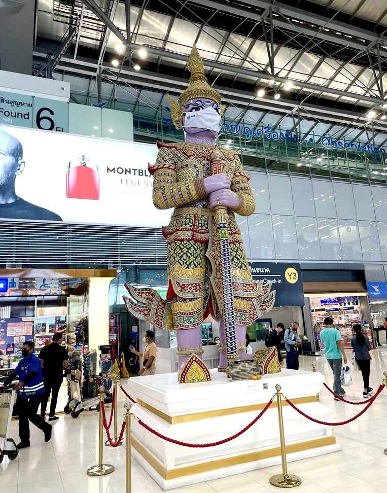 A yaksha, one of guardian warriors who keep away evil spirits. The various yaksha in Suvarnabhumi Airport are replicas of the famous yaksha at the Temple of the Emerald Buddha, Wat Phra Kaeo.