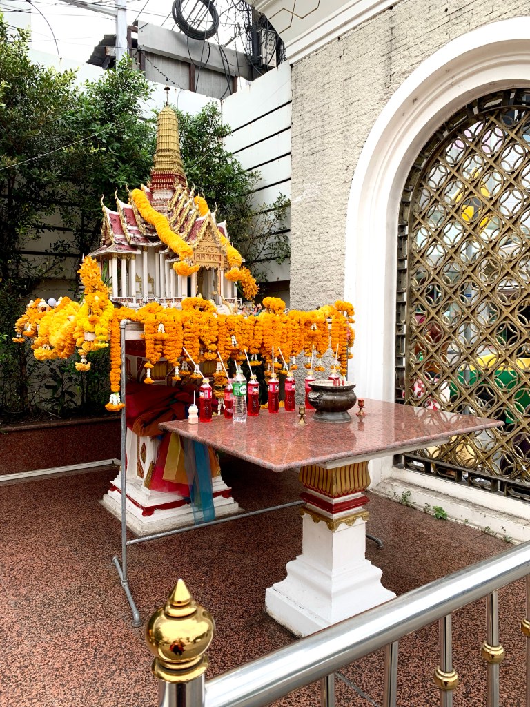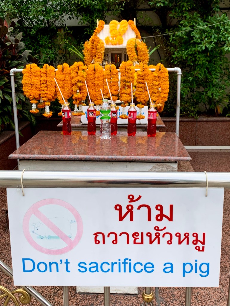 Votive offerings of food and drink are also left at the shrine daily to propitiate the spirits. Rice, betel leaves, pieces of cooked chicken, bananas, coconuts and Thai sweets and desserts are common offerings. One of the most ubiquitous of offerings are bottles of sugary red, strawberry-flavoured Fanta. It is likely that the red colour of the Fanta also symbolizes the blood of sacrificial animals