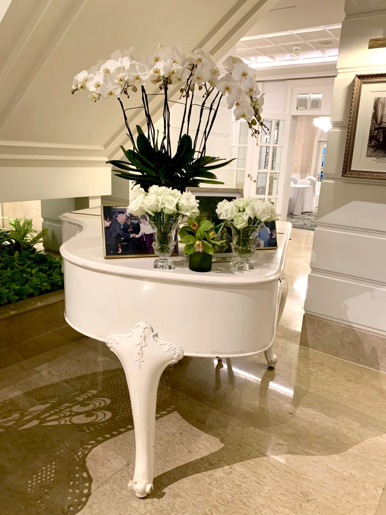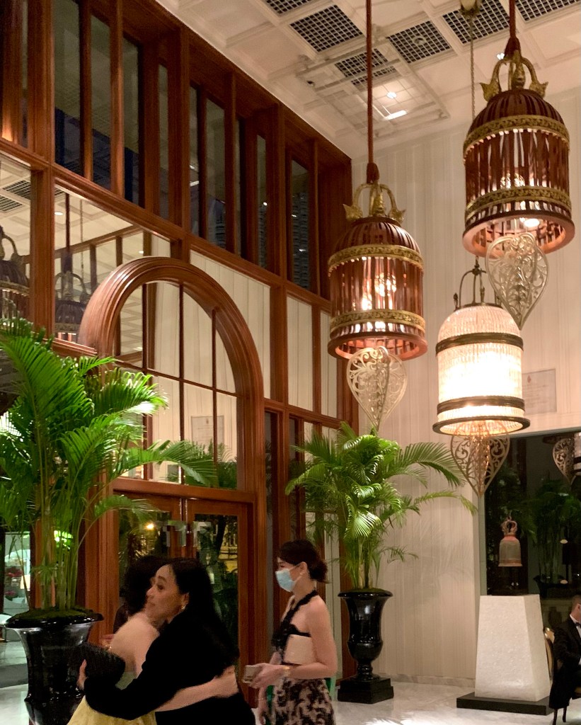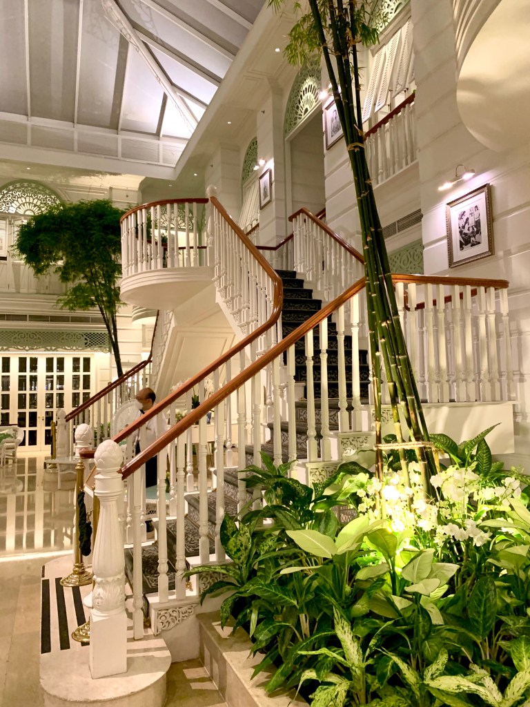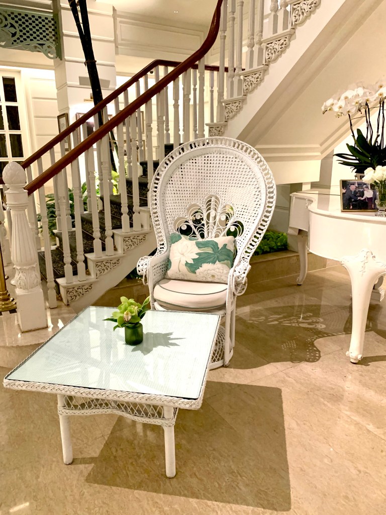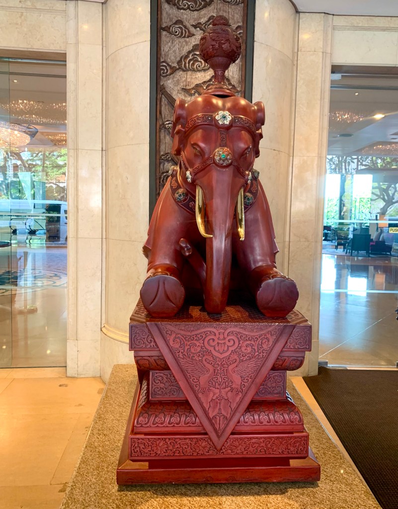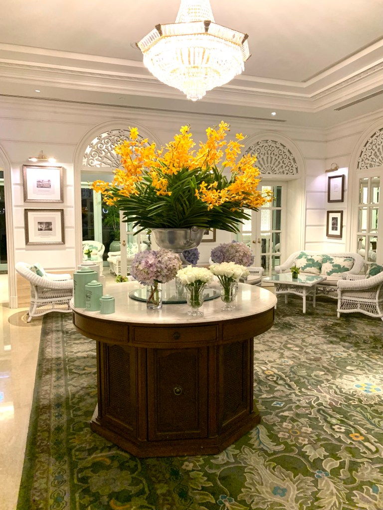 Tonight, the 10th of January 2023, is the last night we’ll be in Bangkok on this trip as we fly to Auckland, via Sydney, tomorrow afternoon. We decided to have dinner at The Verandah, which is the Mandarin Oriental’s coffee shop. The Mandarin Oriental Bangkok is a very beautiful and elegant hotel, one of SE Asia’s great hotels, and it has an interesting history. The lobby of the hotel is very elaborate and lavish in its decor.