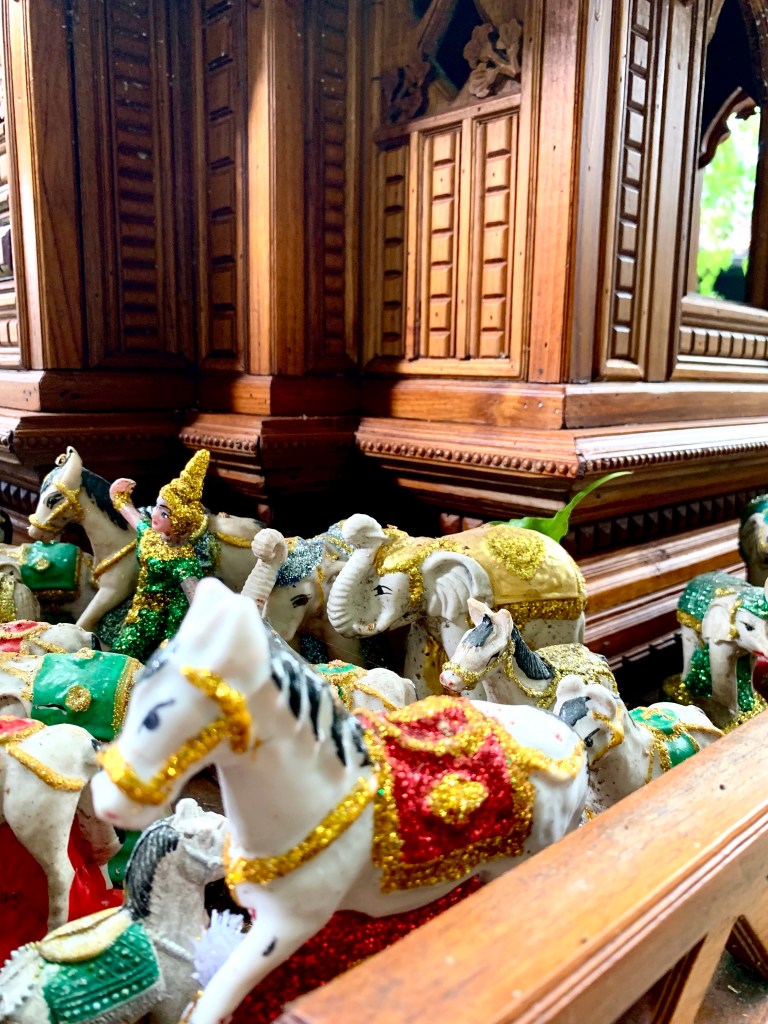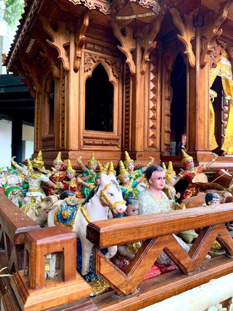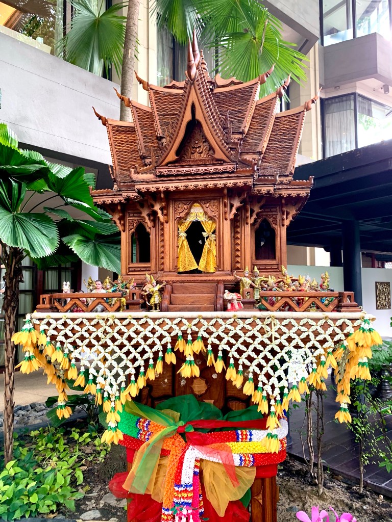 In Thailand and other countries in this part of the world, old animistic beliefs are completely entwined with Buddhism and you see colourful spirit houses everywhere.