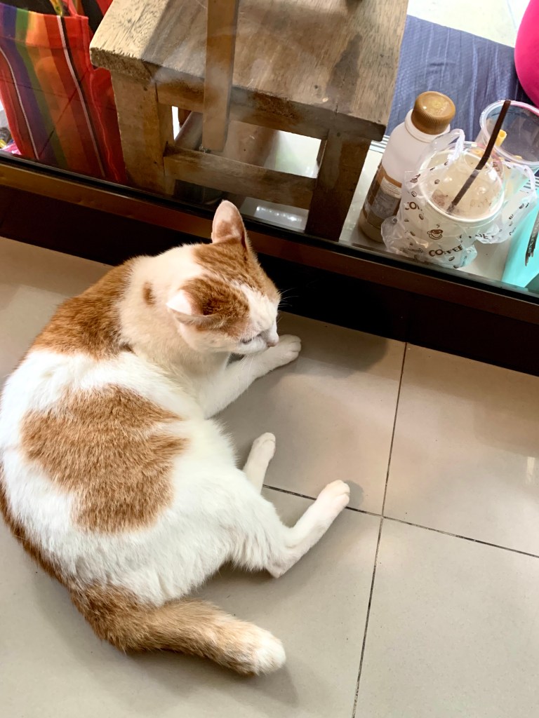 The succession of girls who do the massages come and go and always seem to stay the same age but May and her cats have aged gracefully over the years. The oldest cat died of leukemia during the time we were here last, about 3 years ago, much to May’s sorrow and grief, but that cat’s children and grandchildren carry on her legacy of being pampered and sleeping most of the day, while being the real bosses in charge of the shop.