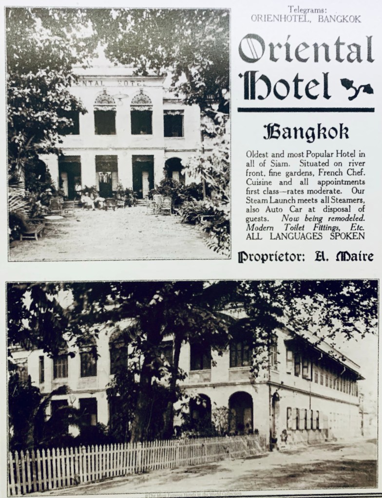 The Authors’ Lounge is located on the ground floor of the original Oriental Hotel, which was built in the 1870’s and still retains a look of the early 1900s, with its elegant white wicker furniture and hand-painted fabrics. It is named for the many famous writers who have stayed at the hotel since the late nineteenth century, most notably Somerset Maugham, Joseph Conrad, Noel Coward and Graham Greene. There are precious old black-and-white framed photographs of many of those authors on the walls of the lounge, many of them signed by the authors. There are also old photographs of Thailand and the Thai royal family from the 19th century.