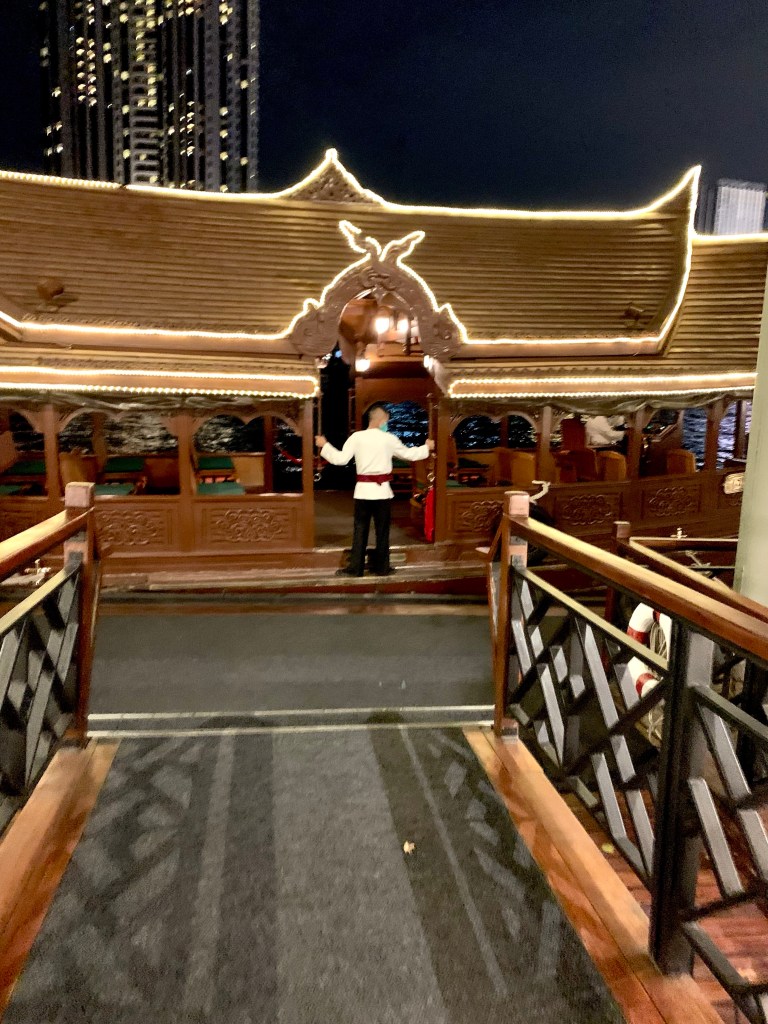 After having a wander around these gorgeous (by then closed) rooms, we got the hotel’s shuttle boat back to the Shangri-la. It was a very short but delightful little ride on the River of Kings. A very nice ending to a lovely evening on our last night in Bangkok.
